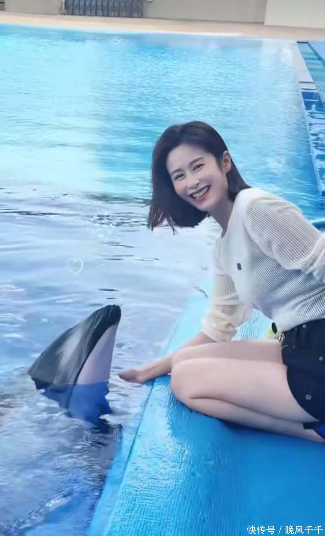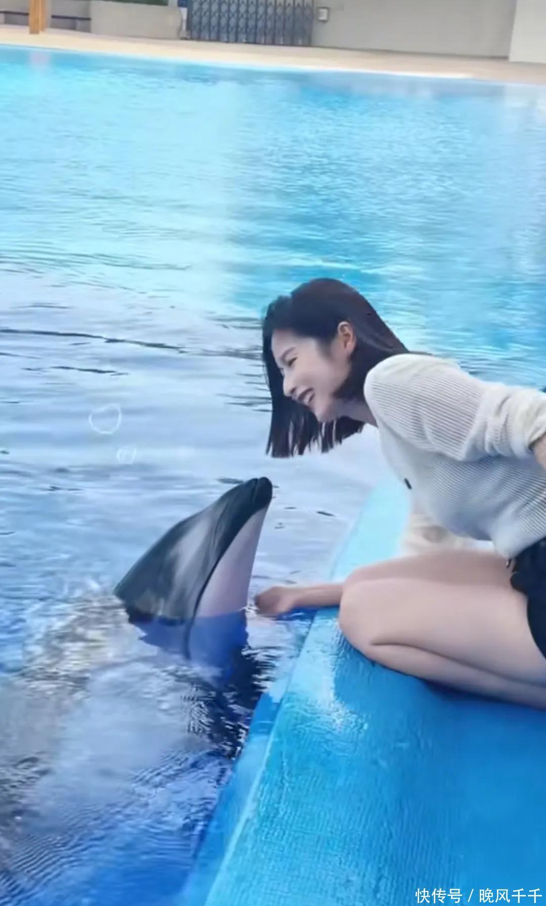 颖儿的胆子大,她双腿跪在水池边与海豚互动亲吻,脸上的兴奋模样藏都藏不住。