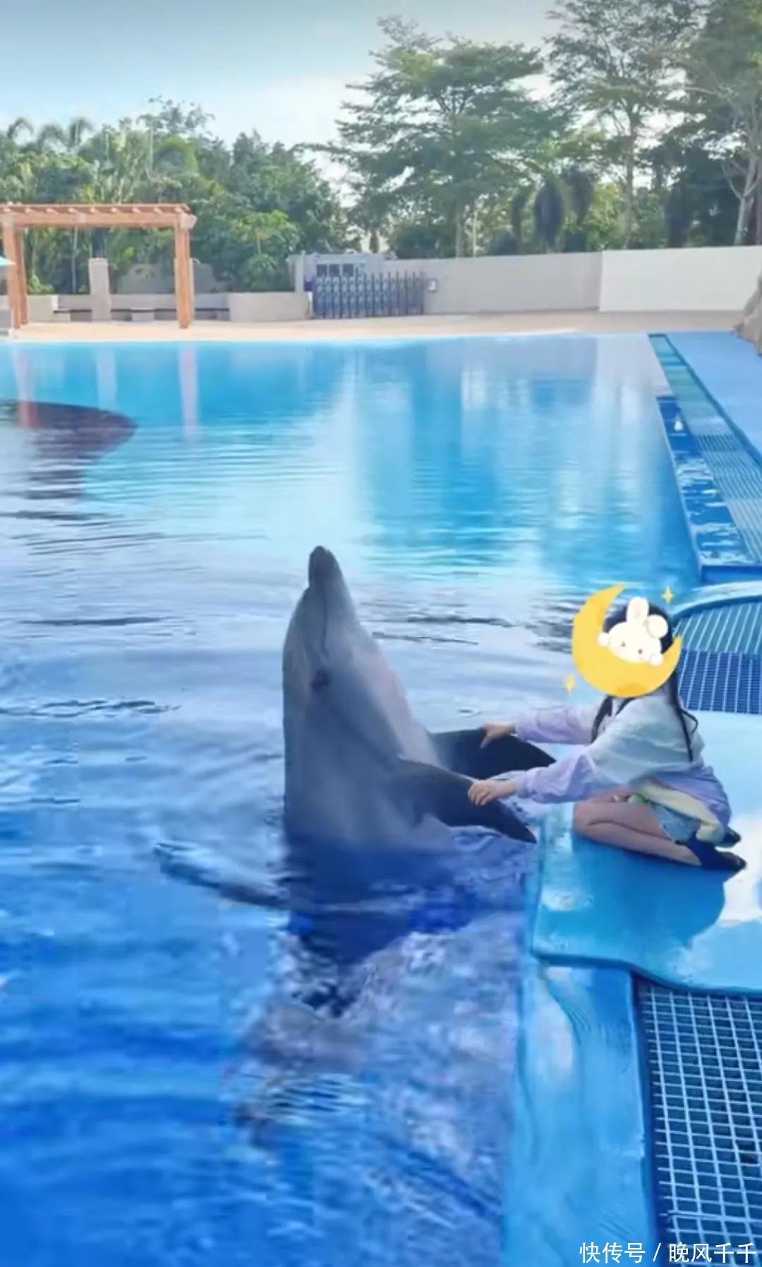 画风一转,颖儿和女儿站在海豚池边在工作人员的指导下与海豚互动。